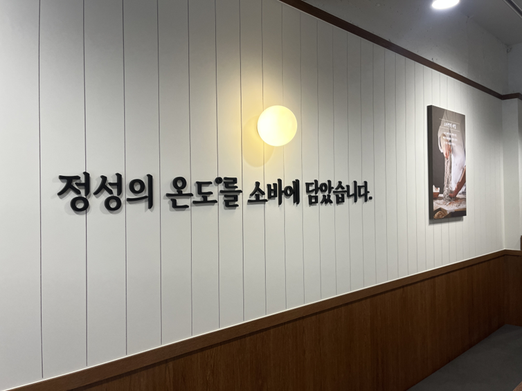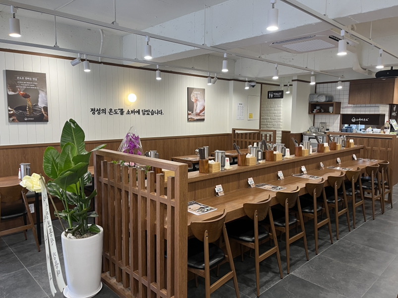 특히 인테리어는 이번 고대점에서 가장 두드러지는 부분이다. 매장 곳곳에는 메뉴를 직관적으로 보여주는 액자형 POP과 ‘정성의 온도를 소바에 담았습니다’라는 브랜드 메시지가 담긴 벽면 슬로건이 배치되어 있으며, 혼자 방문한 고객도 편안하게 식사할 수 있도록 단독 좌석이 마련되어 있다.